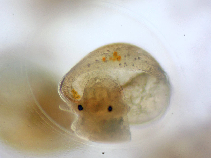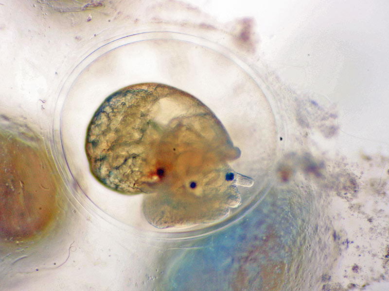 Jungschnecke kurz vor dem Schlupf. Bereits innerhalb der Eihülle kriecht sie ständig, allerdings ständig im Kreis.
