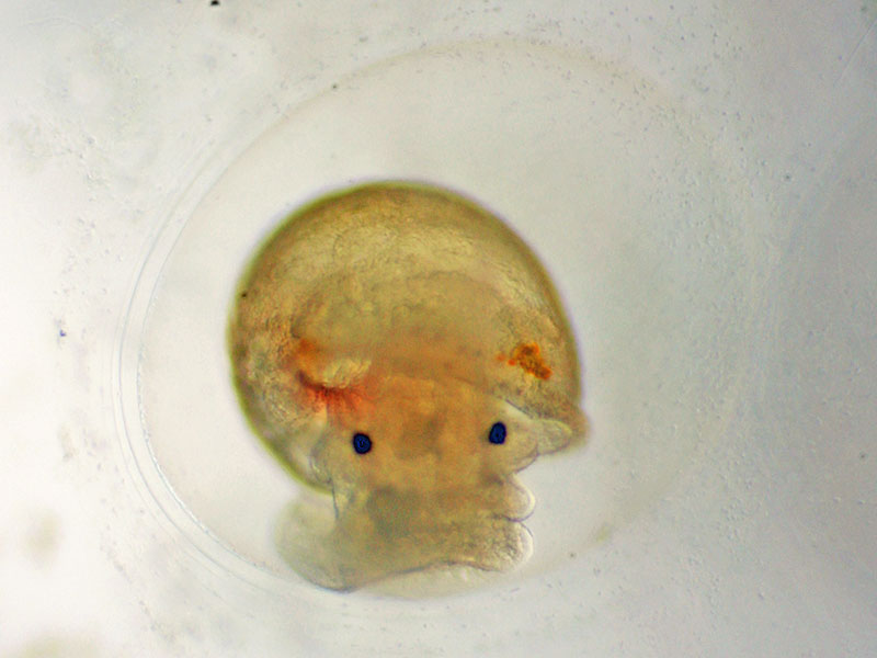Embryo am Beginn siener Entwicklung. Bereits jetzt sind Mantel und Kopffuß deutlich voneinander abgesetzt.