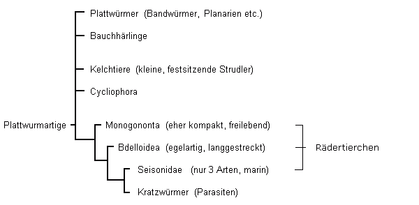 Um den fraglichen Verwandschaftsgrad zu den Kratzwürmern zu verdeutlichen, wurde in obiger Grafik das Taxon (= Gruppe) "Rädertierchen" weggelassen.