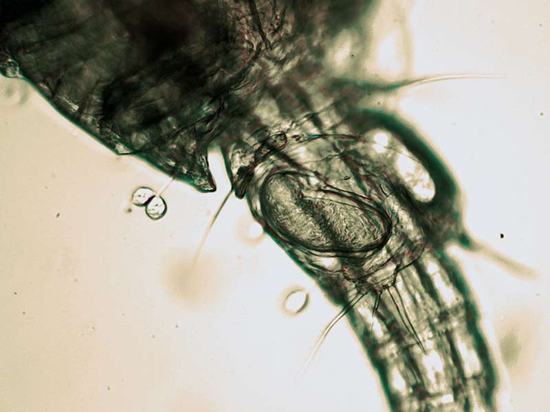 Die Geschlechtsöffnung, der Ort an dem die Eier austreten, befindet sich im ersten Abdominalsegment.