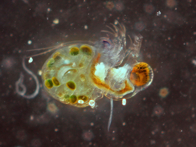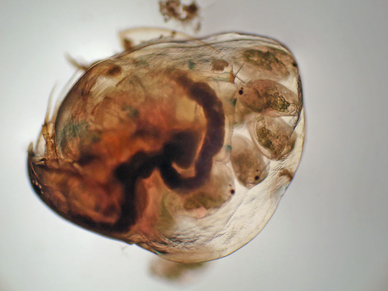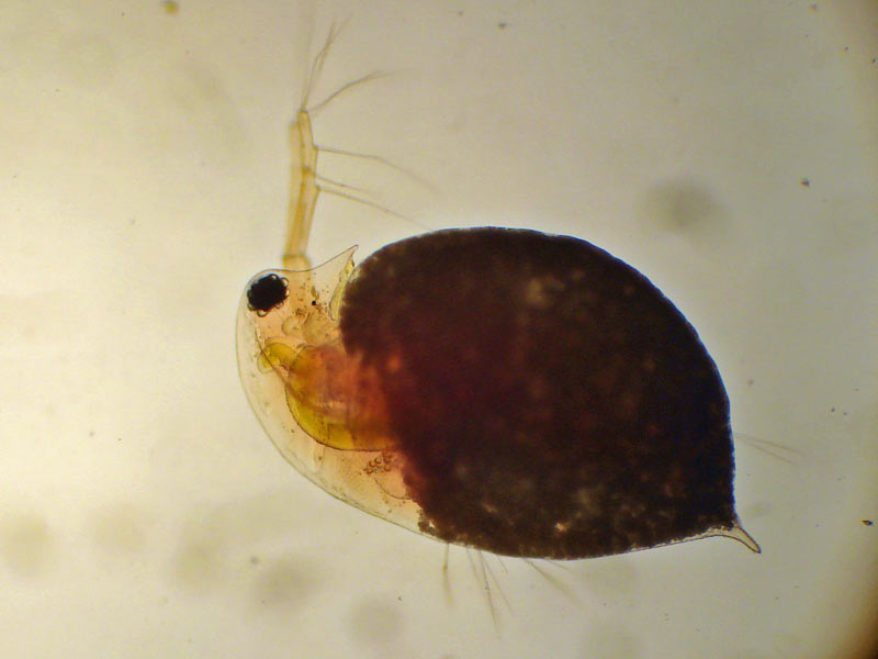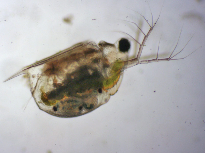 Daphnia verfügt zwar über keinen geschlossenen Blutkreislauf, aber über ein Herz, das deutlich sichtbar schlägt.