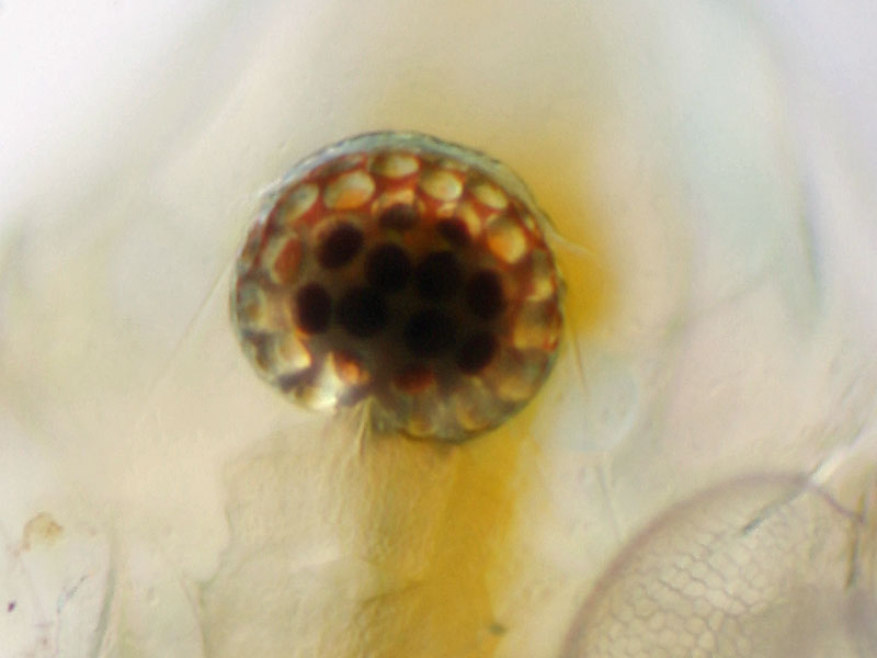 Kleinste Luftbläschen geraten in die Schalenzwischenräume der Daphnien und beeinflussen ihren Auftrieb.