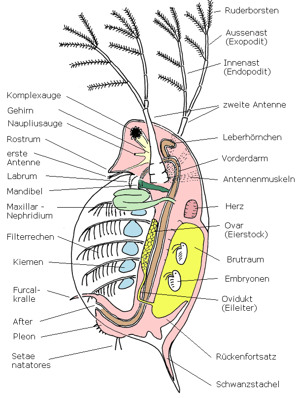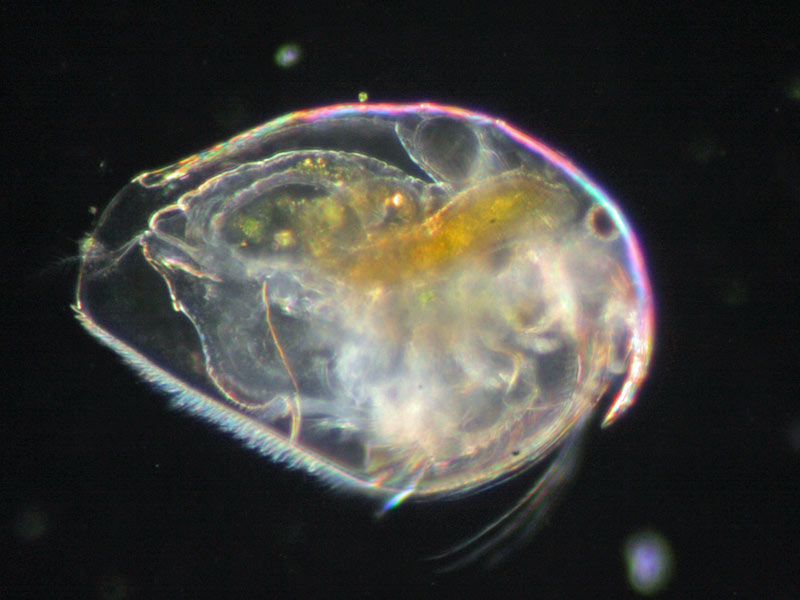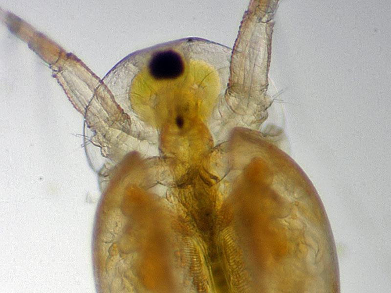 Das typische Kennzeichen eines Wasserflohs ist das beidseitig des Körpers vom Rücken ausgehend zur Bauchseite hin ausgezogene Rückenschild (Carapax).