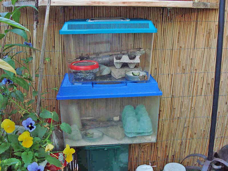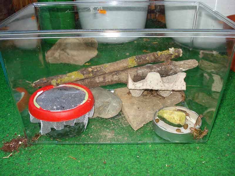 Links: Ganz perfekt ist es noch nicht. Mehr Laufoberfläche und Verstecke, und der Rand von dem Futternapf/Konservenglasdeckel ist zu hoch.