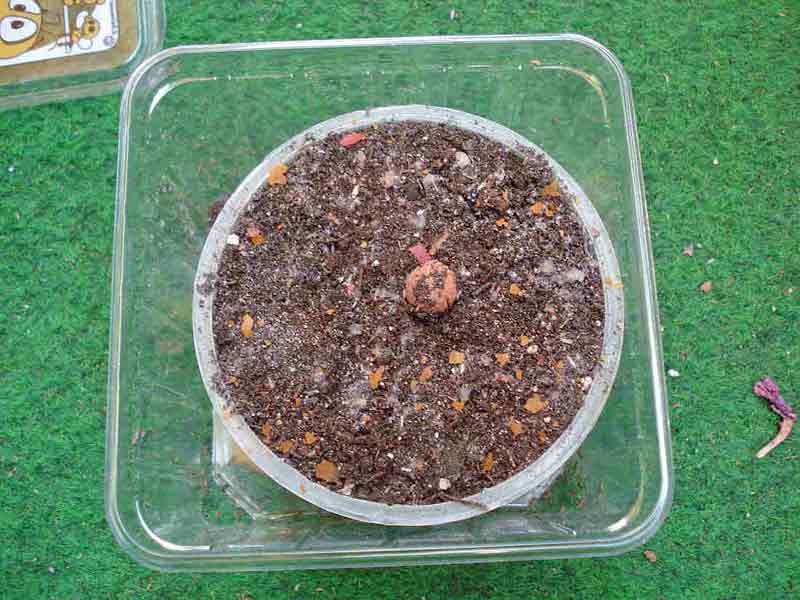Die rötliche Kugel ist Blähton, wie in der Hydrokultur verwendet - ich brauche das als Platzhalter, damit der Deckel der Heimchendose nicht die Oberfläche des Torfs berührt.