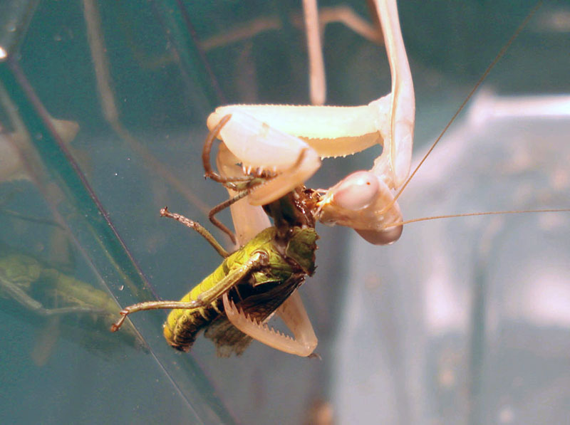 Gut, war ein bißchen ungeschickt von mir, einer Mantis in so einer wackeligen Lage ein Futtertier vor die Fänge zu halten, aber auch mit dieser Herausforderung ist sie klargekommen.