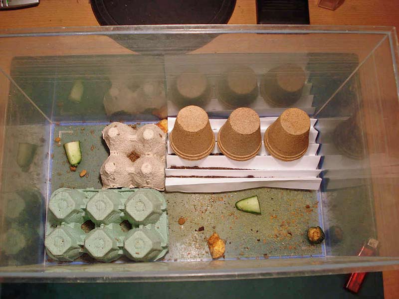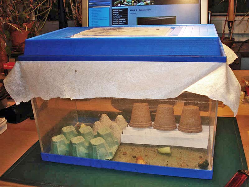 Hier war es erforderlich, eine Pappe L-förmig einzubringen, die seitlich ein Loch zur Befeuchtung des Innenraums aufweist. Pfeifenputzer am Boden halten die Pappe auf Position.