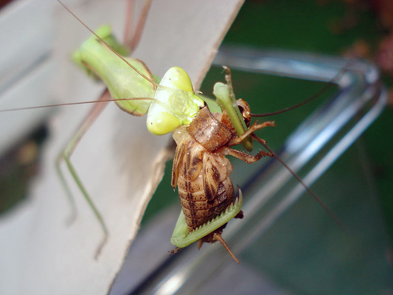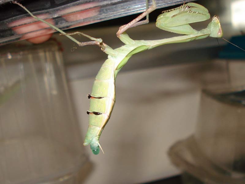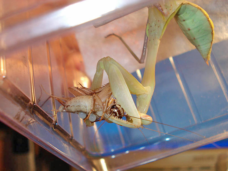 Seitlich quetscht die Mantis den Saft raus und am hinteren Ende vom Heimchen weitere Körpersubstanzen feststofflicher Konsistenz über deren Natur wir auf genauere Informationen geflissentlich verzichten.