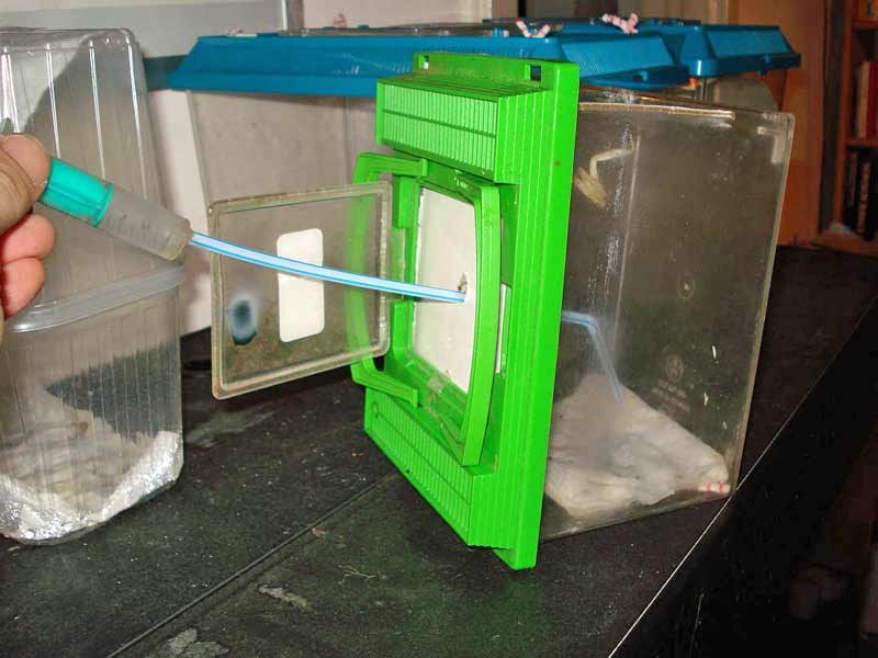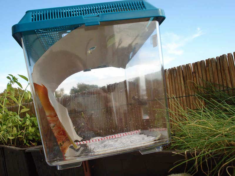 Die blaue Box ist ausstaffiert mit einem Pappdeckel einer Pizza - am Boden ebenfalls eine Pfeifenputzerkonstruktion die das ganze auf Position hält.