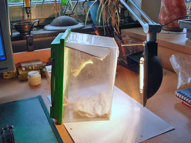 Jeden Tag aber auch der gespannte Blick in die Behälter hinein ob da eine der Nymphen aus ihrer Haut rausgestiegen ist - und täglich ein Stirnzunzeln, keine Häutung, ein achselzuckendes Heimchen-wieder-zurückschütten -