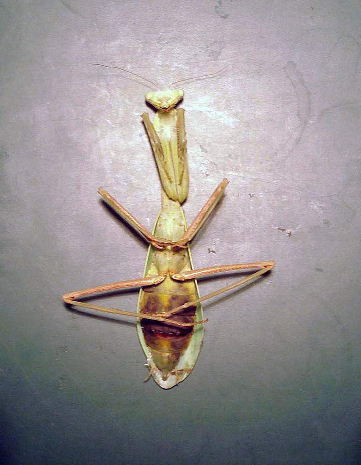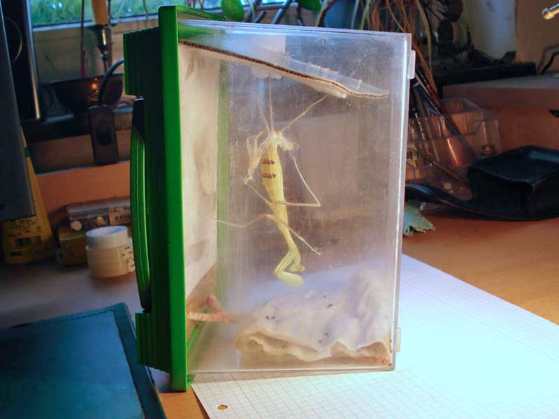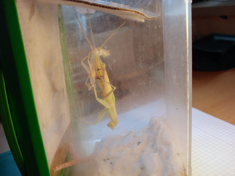 Wie versprochen werde ich die lebensunfähige Mantis Nr.10, die sich in einem jämmerlichem Häutungsunfall um ihr Lebensrecht gebracht hat, dazu verwenden,