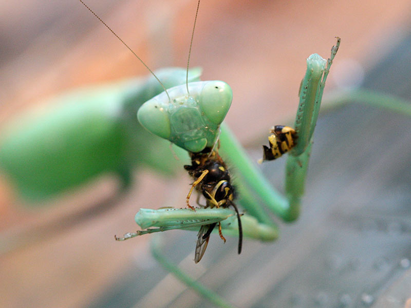 Interessant wäre mal die Frage, ob eine Hierodula mit einer Wespe fertig wird, dh. ob sie schneller reagiert als die Wespe und ihr keine Möglichkeit lässt sie zu stechen.