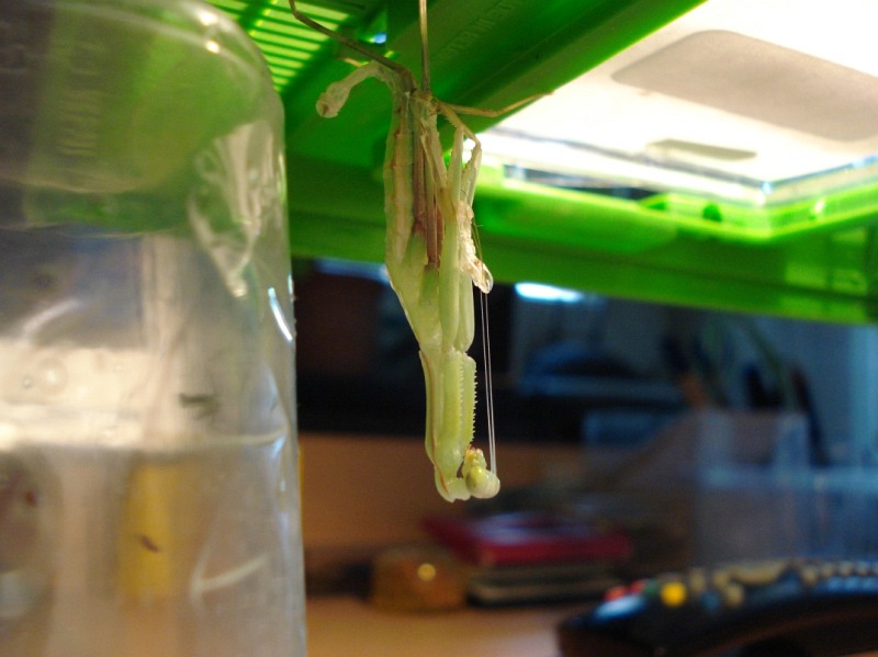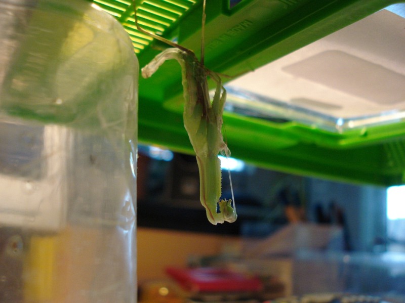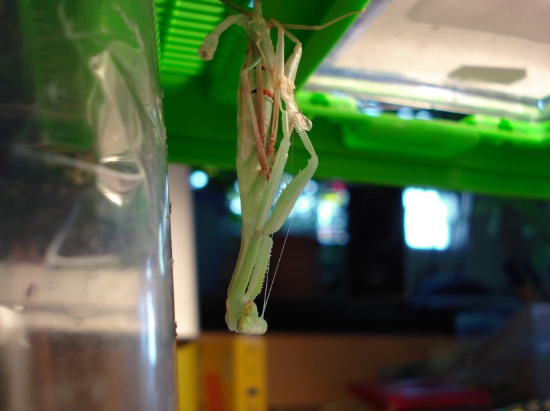 hängt die Mantis nur noch mit dem Ende des Abdomens noch in der alten Haut, die Gliedmaßen hängen in der Luft.