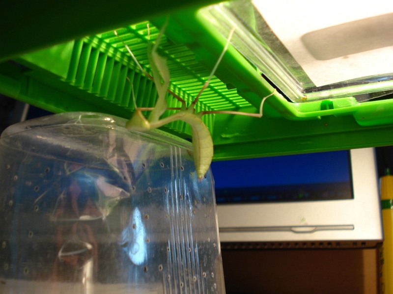 allerdings wird die Mantis vorzugsweise kopfüber an der Decke des Behälters hängen und sich von dieser Marotte mit keinen auch noch so schönen Zweigen abbringen lassen.