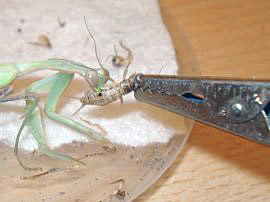 Zwar nimmt die Mantis auch handgereichtes Futter an - man muss es nur mit ruhiger Hand ihr direkt vor die Freßwerkzeuge halten, sie beginnt reflexartig zu fressen.
