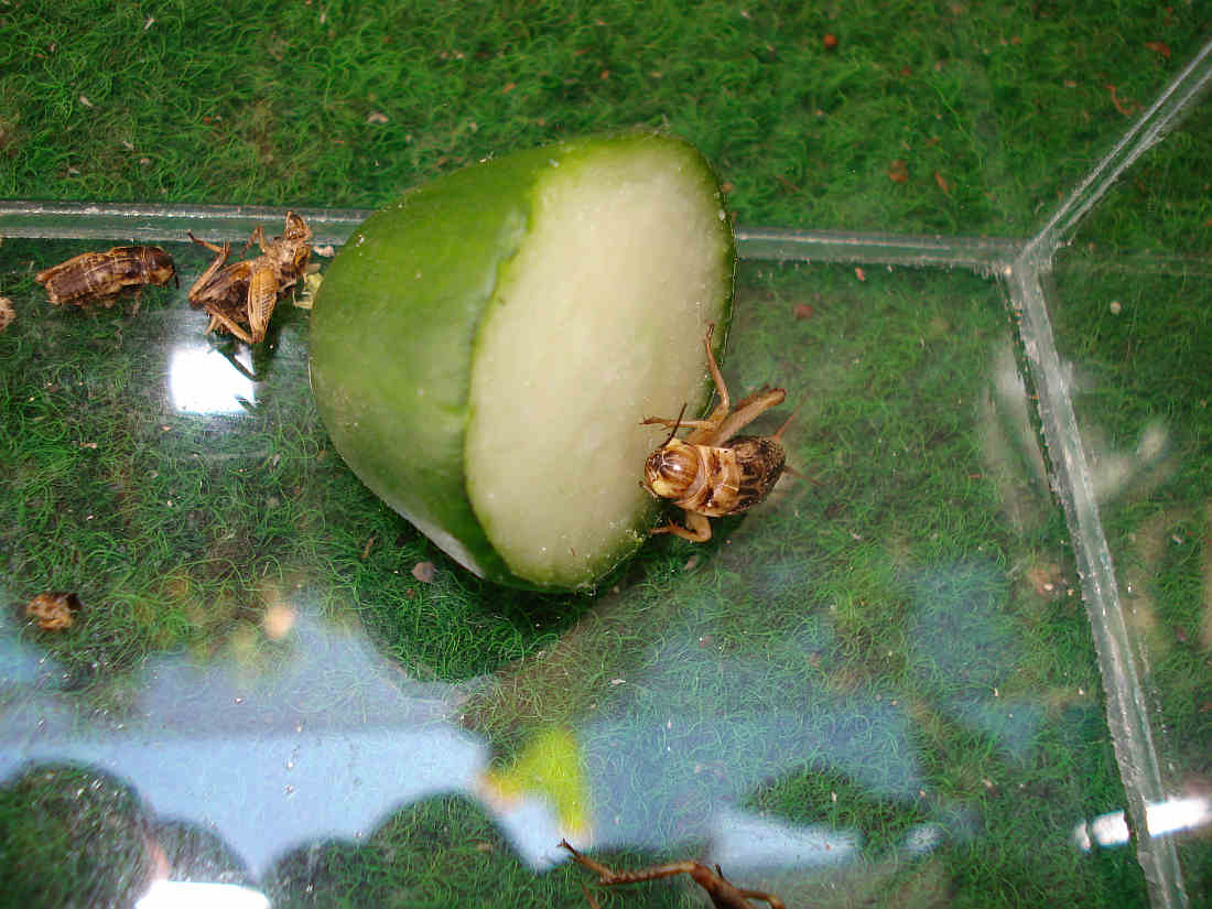Man kann sehr schön sehen mit welcher Gier sich frisch gekaufte Futtertiere auf ein Stück Gurke o.ä. stürzen.