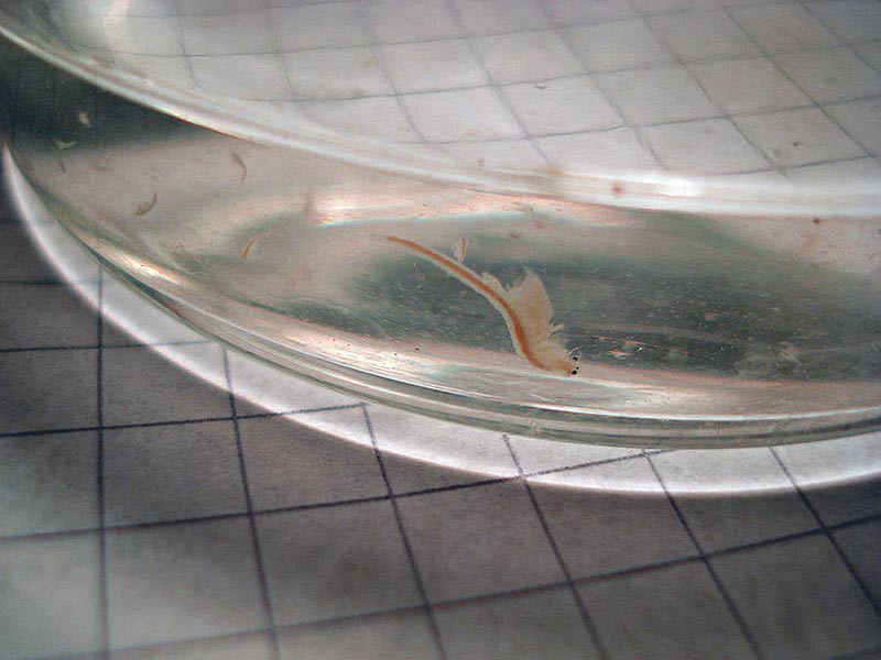 so dass die Würmchen in einer Wolke recht langsam (0,5 cm / sec) dem Boden entgegenschwebten.