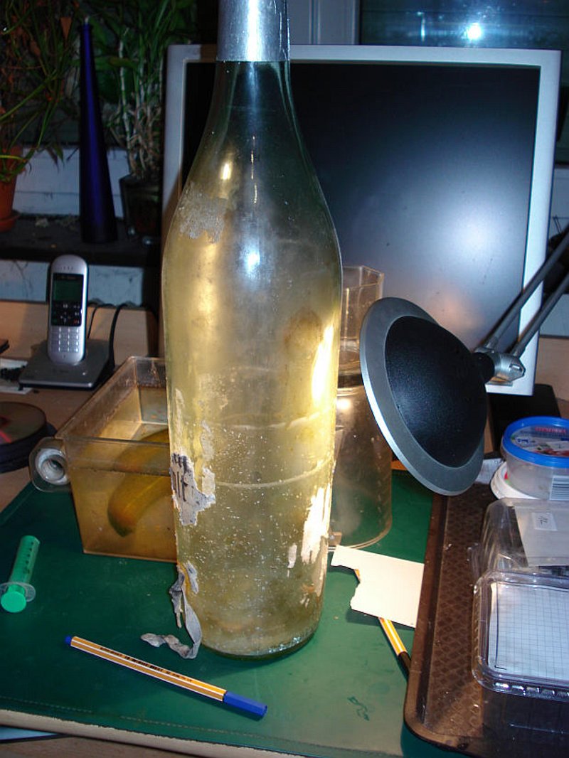 Gelöst wurde das durch dieses Kulturgerät, eine simple Vorrichtung, die man auf eine herkömmliche (Wein-) Flasche aufsetzt und die den Schall quasi in die Flasche einsperrt.