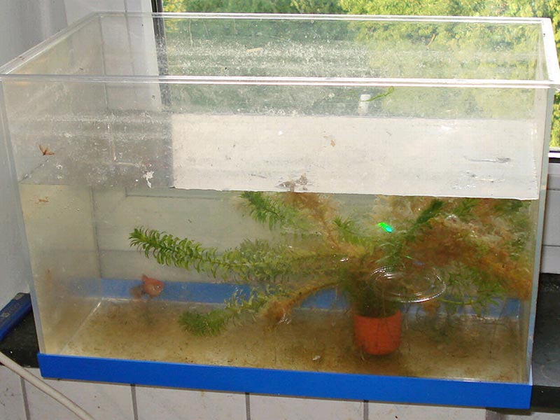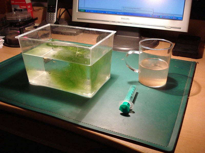 Ich hatte dafür zwei Becken zur Verfügung: Ein älteres 20-Liter Plastikbecken, das in der Küche an einem Ostfenster steht und ein 1,5-Liter Kleinbecken,