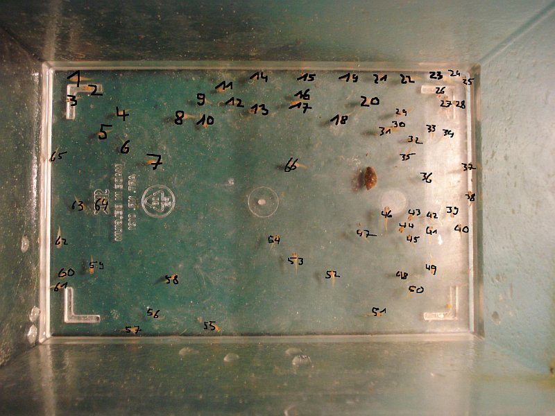 Jetzt im Moment bevölkern etwa 30 Krebse die Flasche, jeder einzelne gut sichtbar mit einer Größe von vielleicht 4 mm.