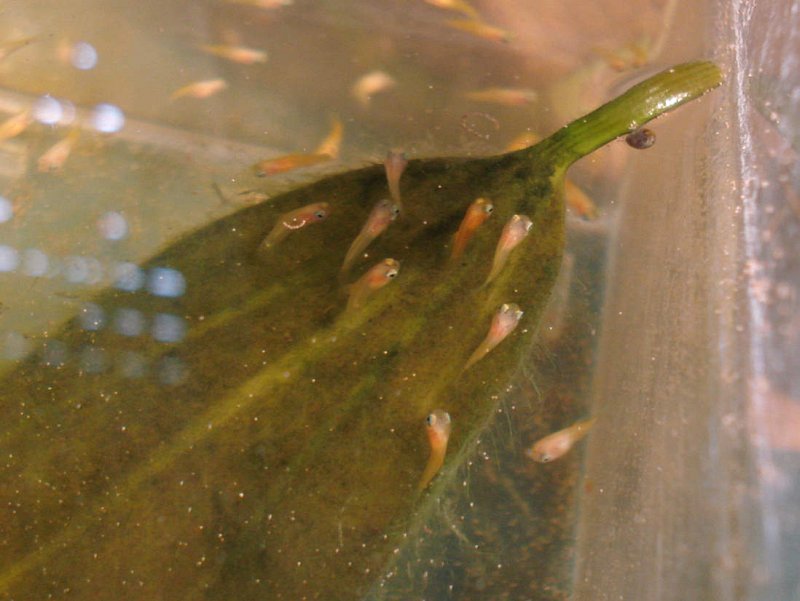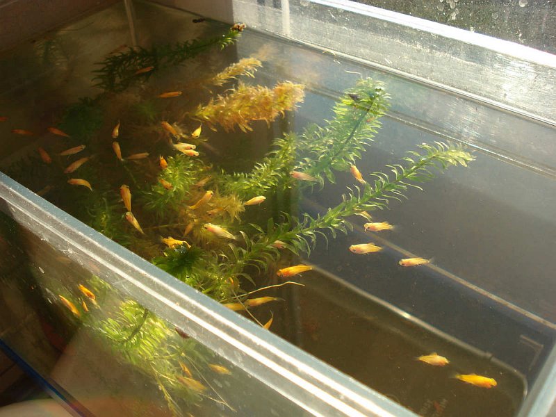 Ich hab das Weibchen sofort rausgenommen und die Jungen in das 1,5 Liter Mini - Becken gesetzt.