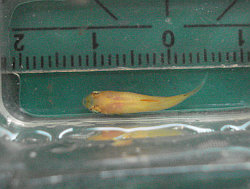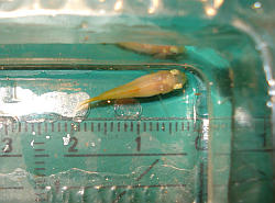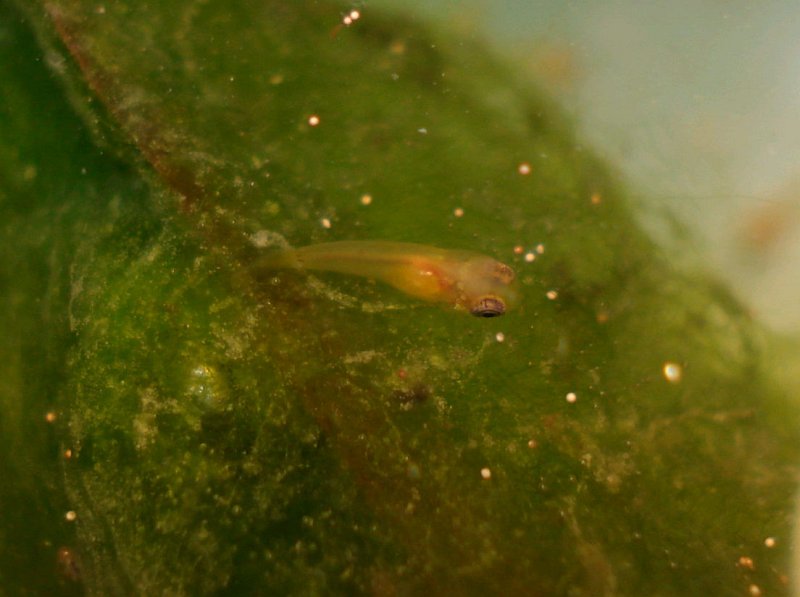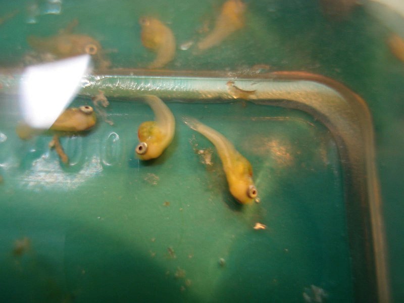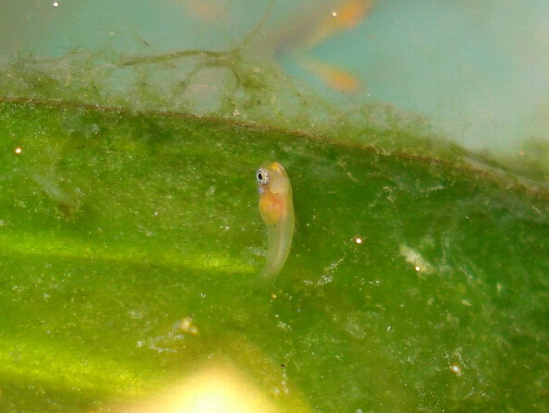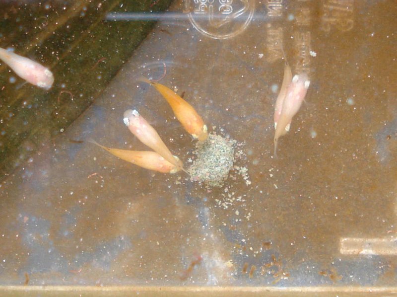 Noch haben sie noch nicht mal ne richtige Fischgestalt; dass sie um die Leibesmitte einigermaßen prall sind sieht man aber nach einer Fütterung schon ganz gut.
