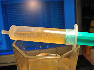 Wenn der Inhalt vom Glas durchgelaufen ist steht der Wasserspiegel in der Tasse etwa 0,5 cm über dem Sieb und die Artemia können mit der Spritze abgesaugt werden.