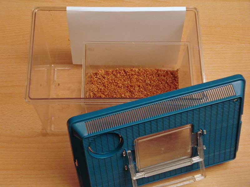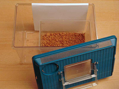 Oder man läßt das Ineinanderstellen und befüllt den Behälter mit den Elterntieren etwa 4 bis 8 cm hoch mit Substrat.