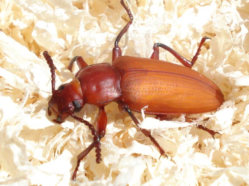 Der etwas kleinere Mehlkäfer (Tenebrio molitor) zählt zur gleichen Familie und ist damit ein naher Verwandter zum Großen Schwarzkäfer.