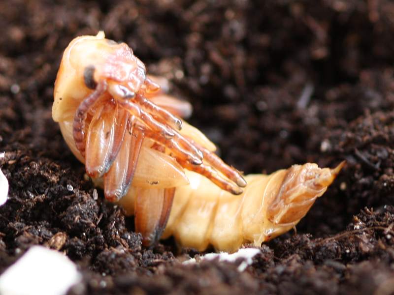 Sobald der Umbau fertig ist, schlüpft ein neuer Käfer aus der zurückbleibenden Puppenhülle.