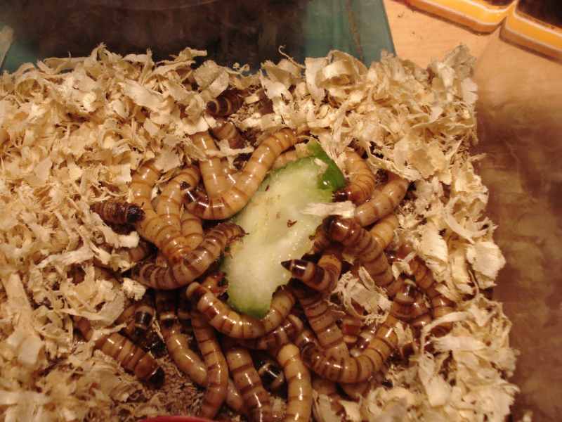 Praktisch, dass die Erwachsenen das gleiche fressen wie die Larven: Obst, Gemüse aller Art, Fischfutter, Haferflocken und Weizenkleie, Trockenkatzenfutter etc.