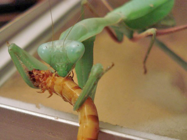 Ich kann hier nur für die Verfütterung an eine Hierodula Stellung beziehen und versichern, dass ein erwachsenens Hierodula-Weibchen stets mit einer Zophobas-Larve fertig wird,